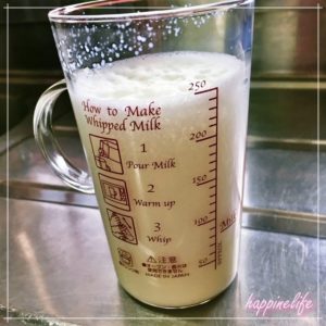 乳脂肪分が少ないものでもつくれますが、泡の弾力が弱くコーヒーにすぐに溶けます。ちなみに、今回使用した牛乳は乳脂肪分2.0%です。