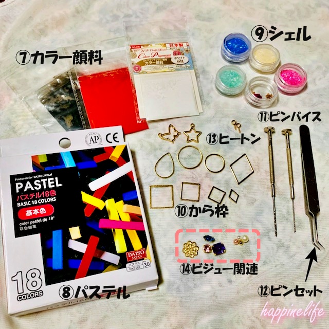 こちらは、個人的におすすめしたいものです。カラー顔料のように色をつけるために使用します。カッター等で削って粉にしレジン液の混ぜます。100円で18色作れるので、気になる方は買ってみて下さい。