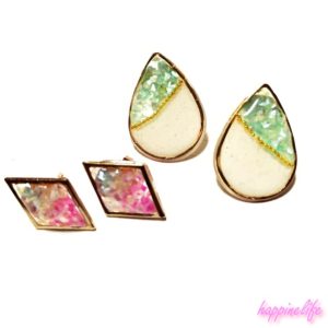 右上のピアスは、しずく型のから枠にグリーンのシェルと白の顔料を合わせバイカラーにしました。境目は、ネイルでよく使われているブリオンを並べました。